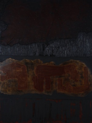 CARVED LACQUER ON WOOD BOARD, LEATHER, OXIDIZED NAILS, GOLD POWDER