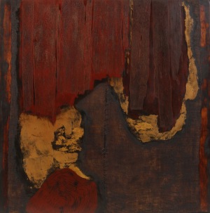 CHINESE LACQUER ON WOOD, RAMIE FABRIC, GOLD LEAF, OXIDIZED BRONZE LEAF, CHESTNUT VENEER