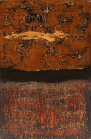 CHINESE LACQUER ON WOOD, RAMIE FABRIC, GOLD LEAF, OXIDIZED BRONZE LEAF